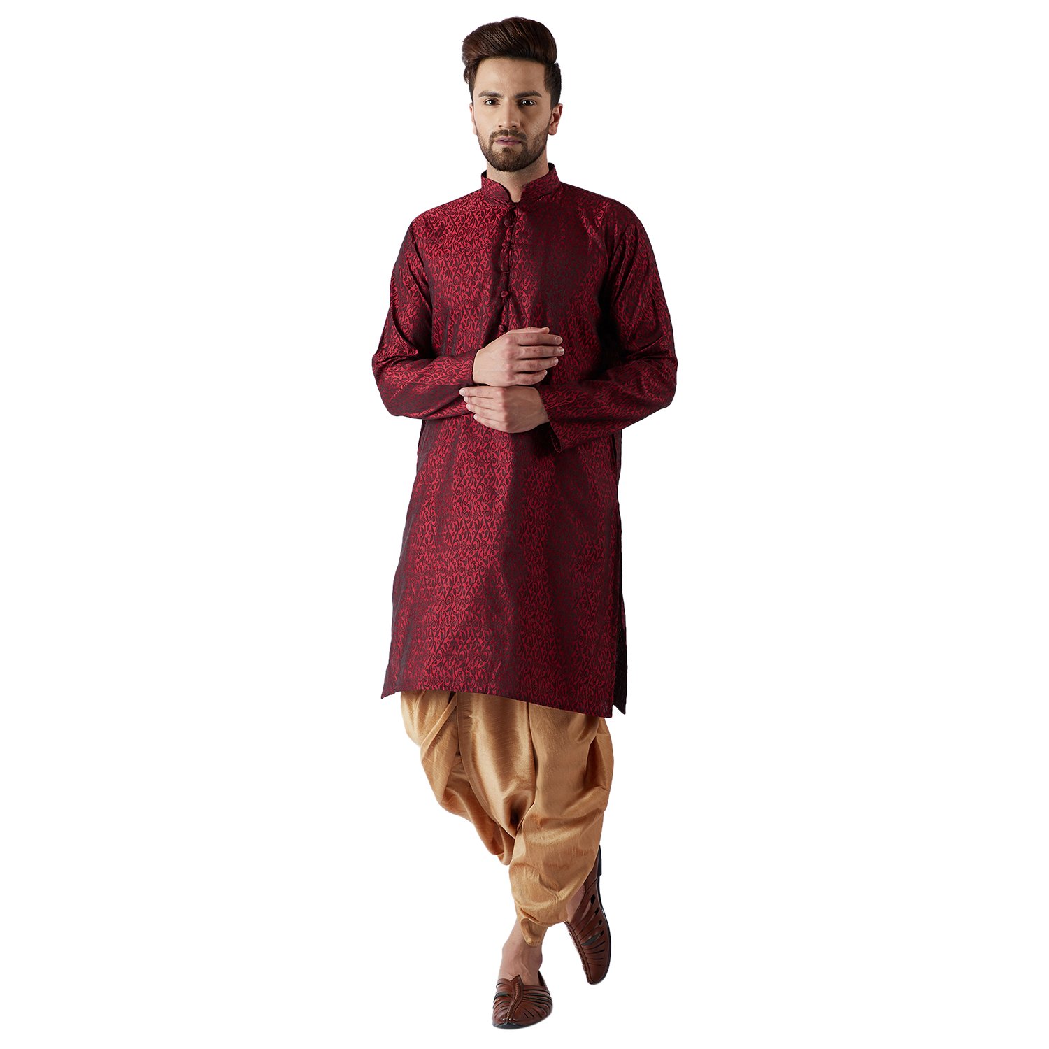 Brand: SOJANYA Color: Maroon and Gold Features: Style: Dhoti Kurta SET, Fabric: Jacquard Silk (80% Silk 20% Cotton) Collar: Mandarin, Sleeves: Full, Fit type: Regular/ Comfort, Length: Knee Length Kurta Product Size Guidance: Please refer to CHEST size measurement in the SIZE CHART for your correct size Fabric Care: 1st wash Dry Clean recommended, then […]