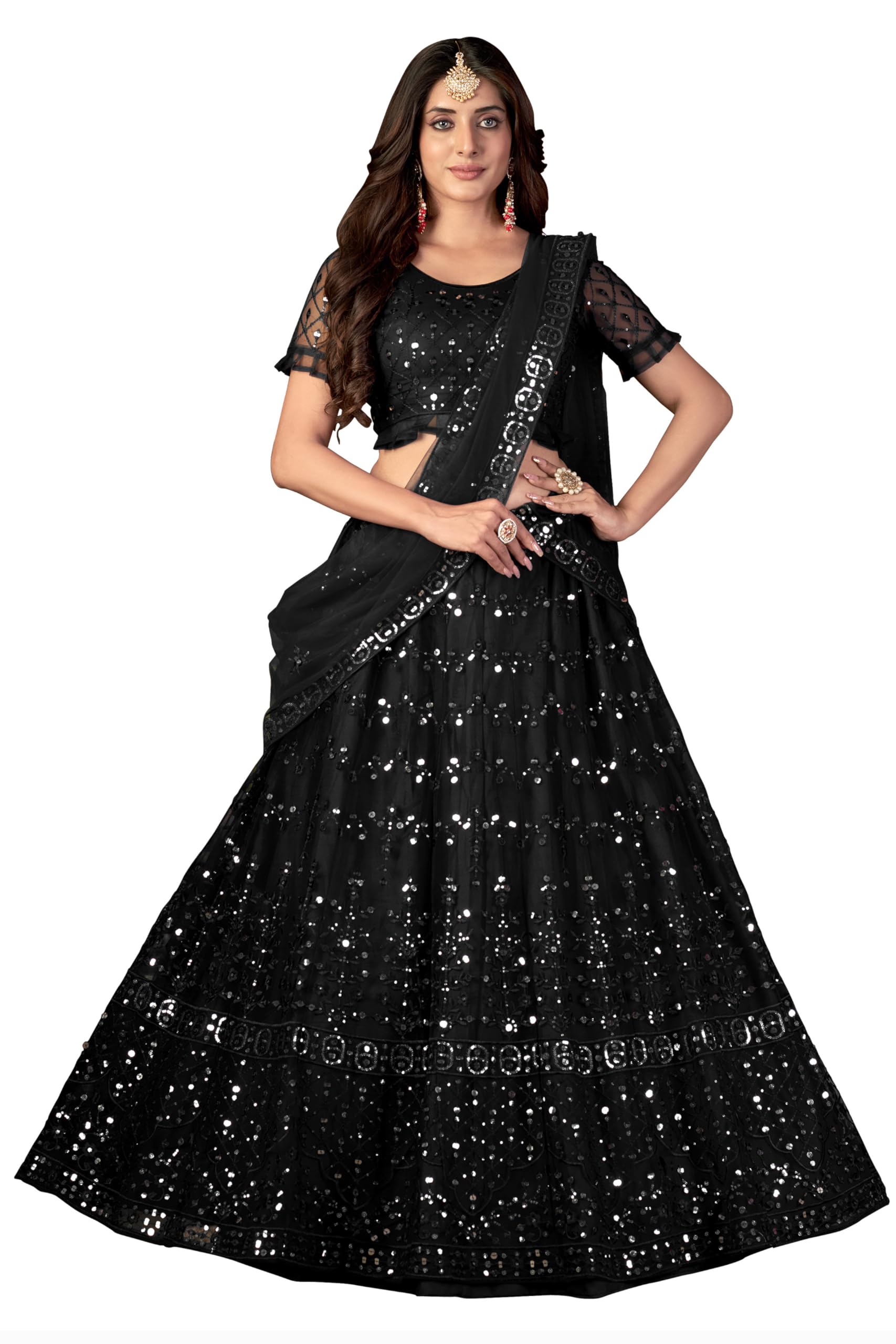 Brand: VARNI FABRICS: A lady’s First Love Color: Black Features: Elegant Net Lehenga with Mirror Work & Half Sleeve Blouse – Featuring all-over mirror embellishments, this flared net lehenga is paired with a round-neck blouse and matching dupatta for a bold, festive look. Semi-Stitched Finish for a Custom Fit – Designed with a semi-stitched structure, […]